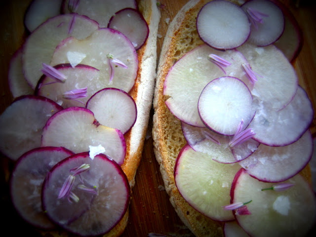 I thought i'd share with you this delicious simple recipe, you could really call it a crudité. It's a classic combination with a little twist, using that smoked butter I made a couple weeks ago. the combination of fresh radish, creamy butter and a bit of sea salt is wonderful. the background smokeyness is a great bonus too. if you don't have a chance to smoke your butter fresh salted butter would be just fine. this recipe is a great starter for dinner or drinks or for a casual picnic in the garden.